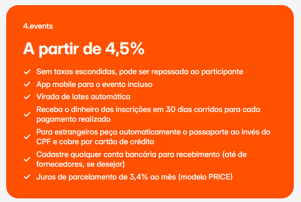 É exatamente para combater esse modelo predatório que a 4.events se posiciona como a parceira definitiva do produtor independente e das empresas de médio e grande porte, oferecendo a menor taxa de bilheteria para eventos no Brasil: cravada em 4,5%.