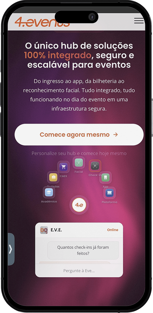 A 4.events não entrega apenas um software; entrega um ecossistema all-in-one em que a E.V.E. é a inteligência que conecta cada módulo. Diferente de plugins e sistemas externos, a E.V.E. é nativa e tem acesso autorizado ao banco de dados, garantindo segurança nível bancário a mesma utilizada pelo Banco BTG Pactual em seus eventos de elite.